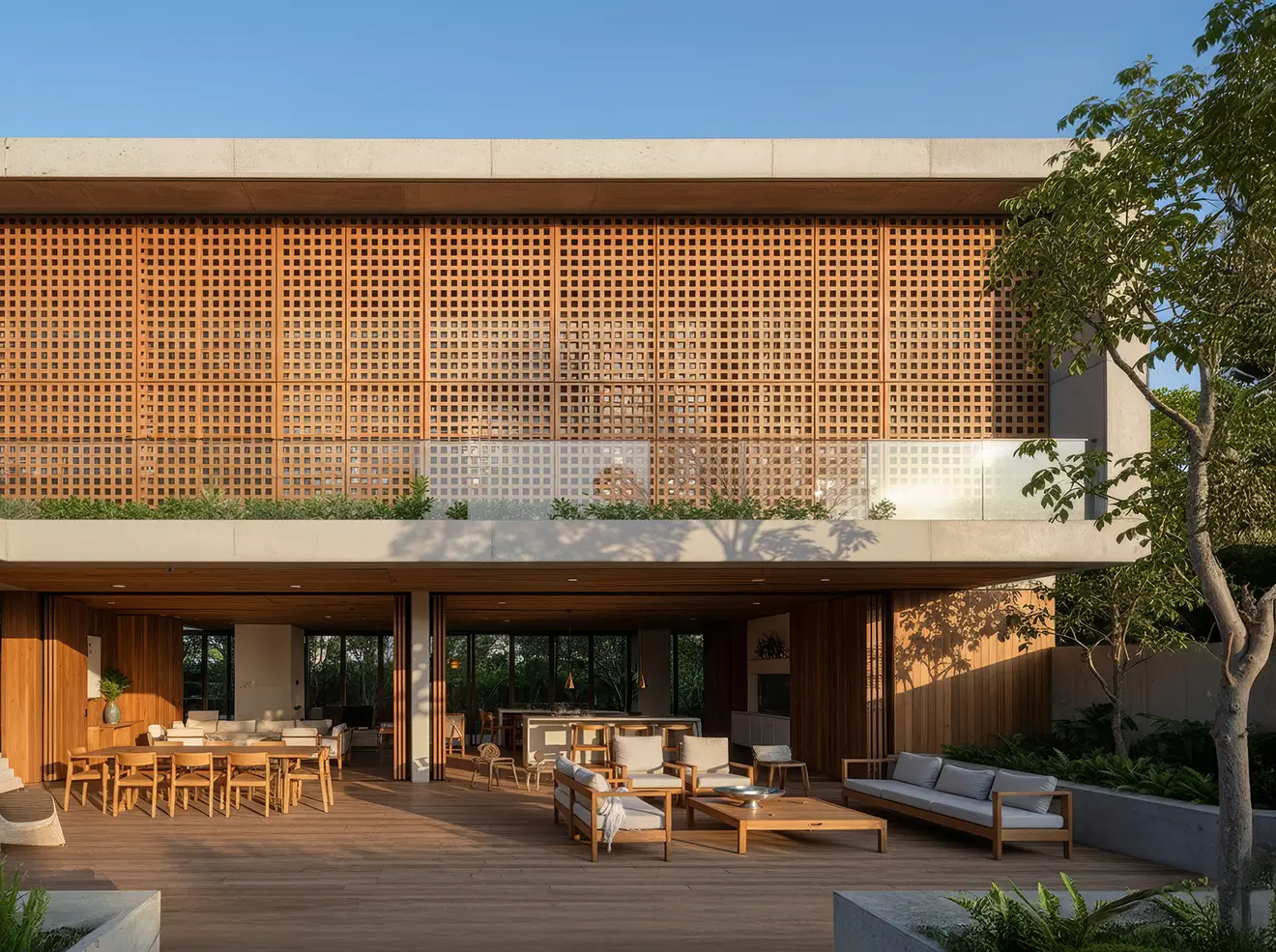 Arkowood X and Thermowood X reinterpret the muxarabi into a system that blends art, functionality, and natural texture, creating facades and partitions that filter light with lightness, rhythm, and privacy.