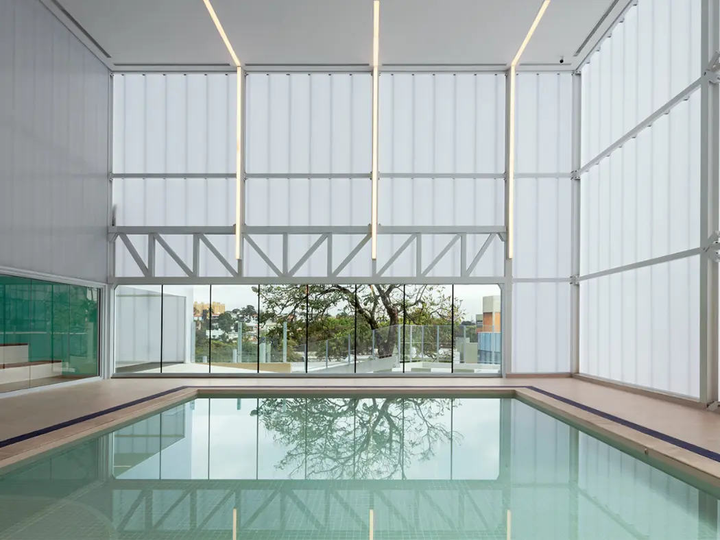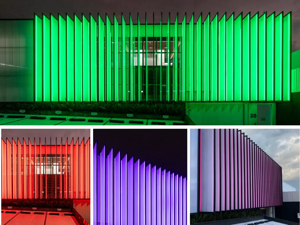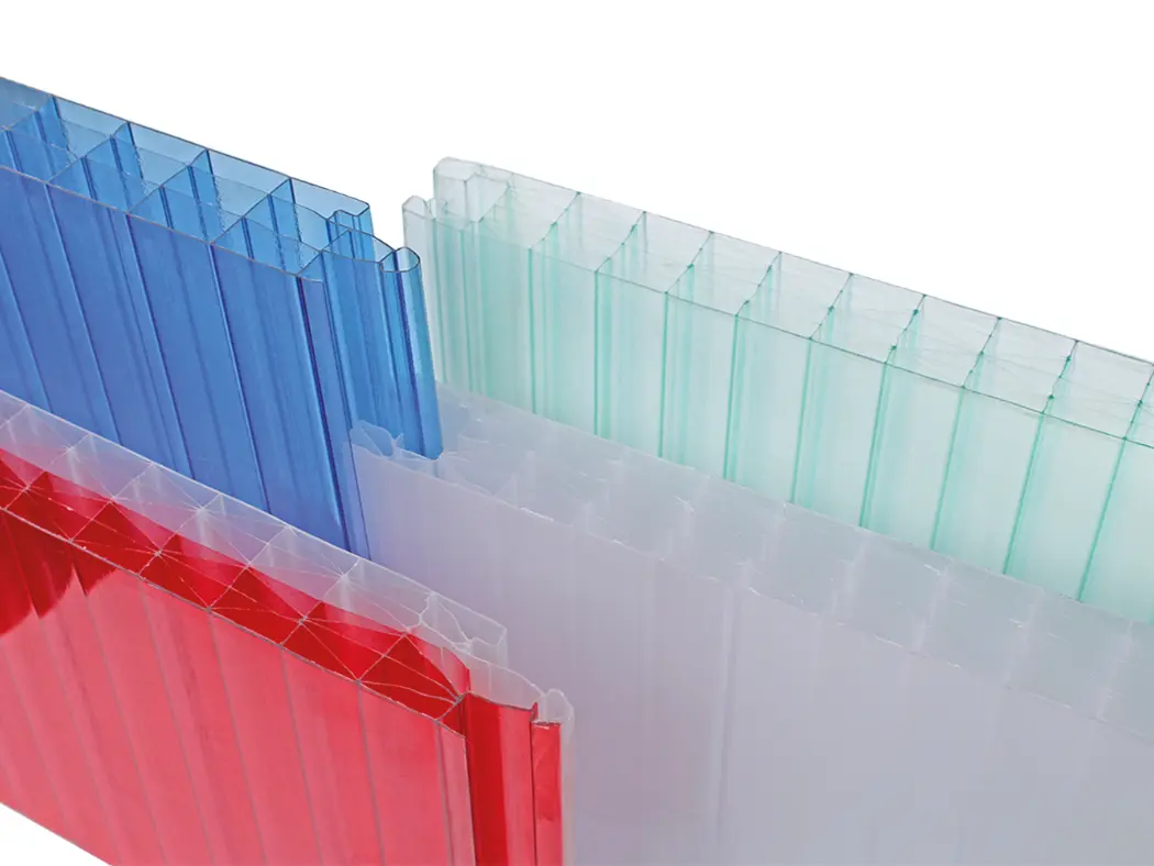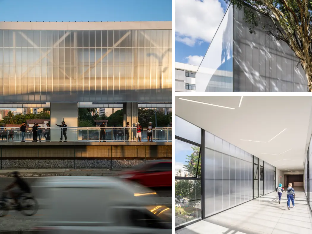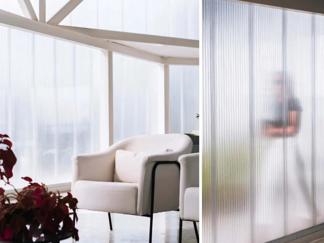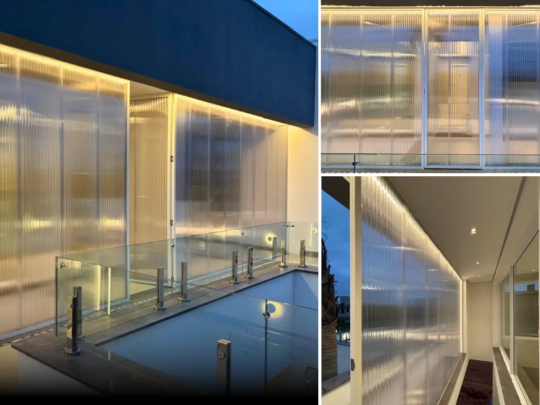Paneles de policarbonato estructural para interiores y exteriores, (fachadas y muros divisorios). Estos paneles tienen una estética diferente en el lugar aplicado al permitir una increíble transmisión de luz. Algunas de sus ventajas son su aislamiento acústico, térmico y practicidad en su instalación.