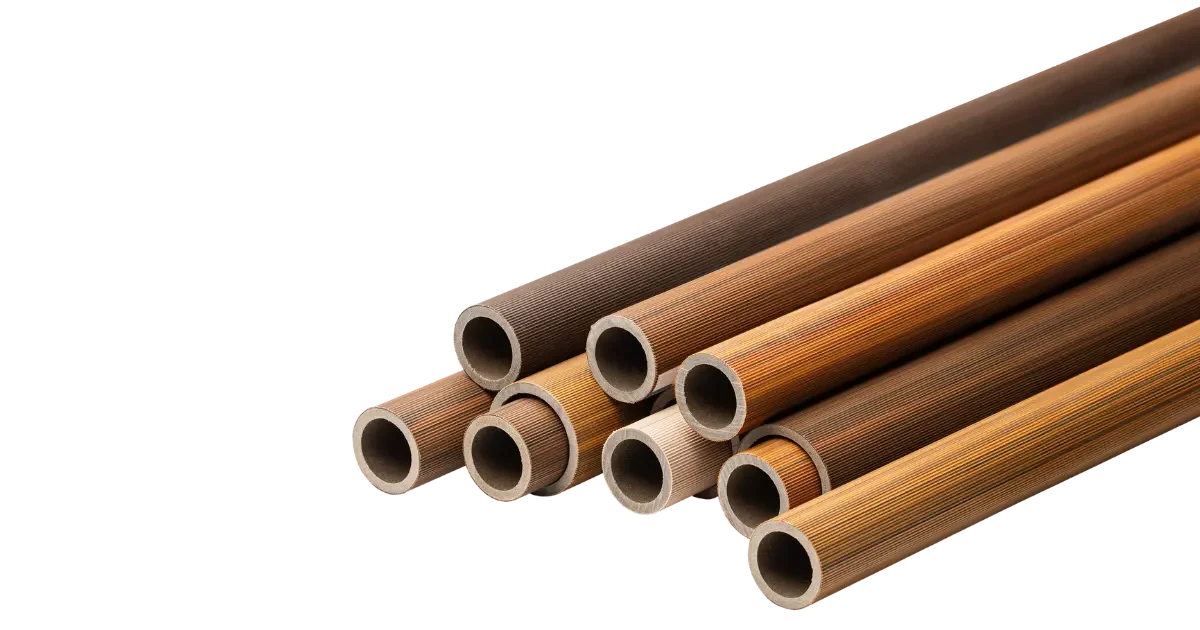 Perfiles circulares no estructurales, compuestos de madera ecológica y HDPE, diseñados para ofrecer alta resistencia a las condiciones climáticas tanto en exteriores como en interiores. Su ligereza y flexibilidad brindan amplias posibilidades de diseño, permitiendo crear estructuras versátiles y adaptables a una gran variedad de proyectos arquitectónicos y decorativos.