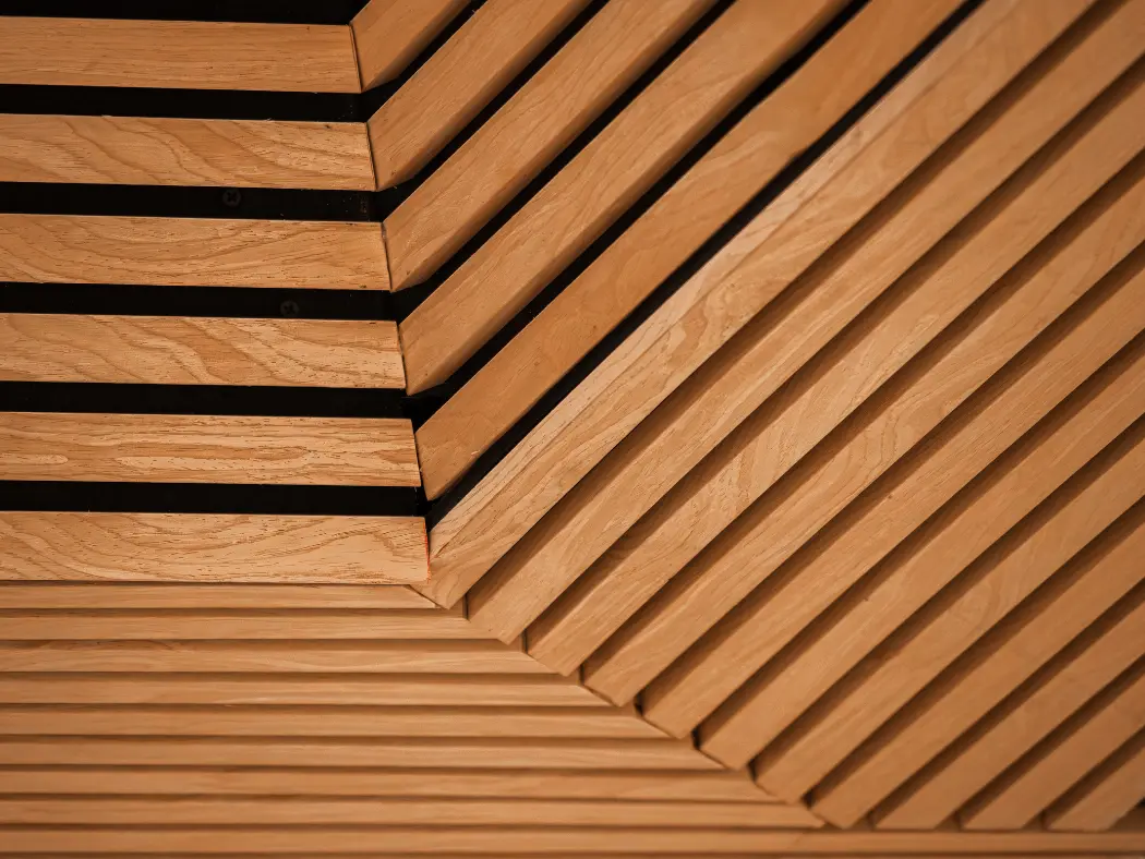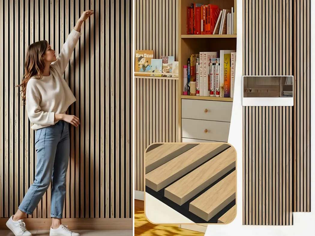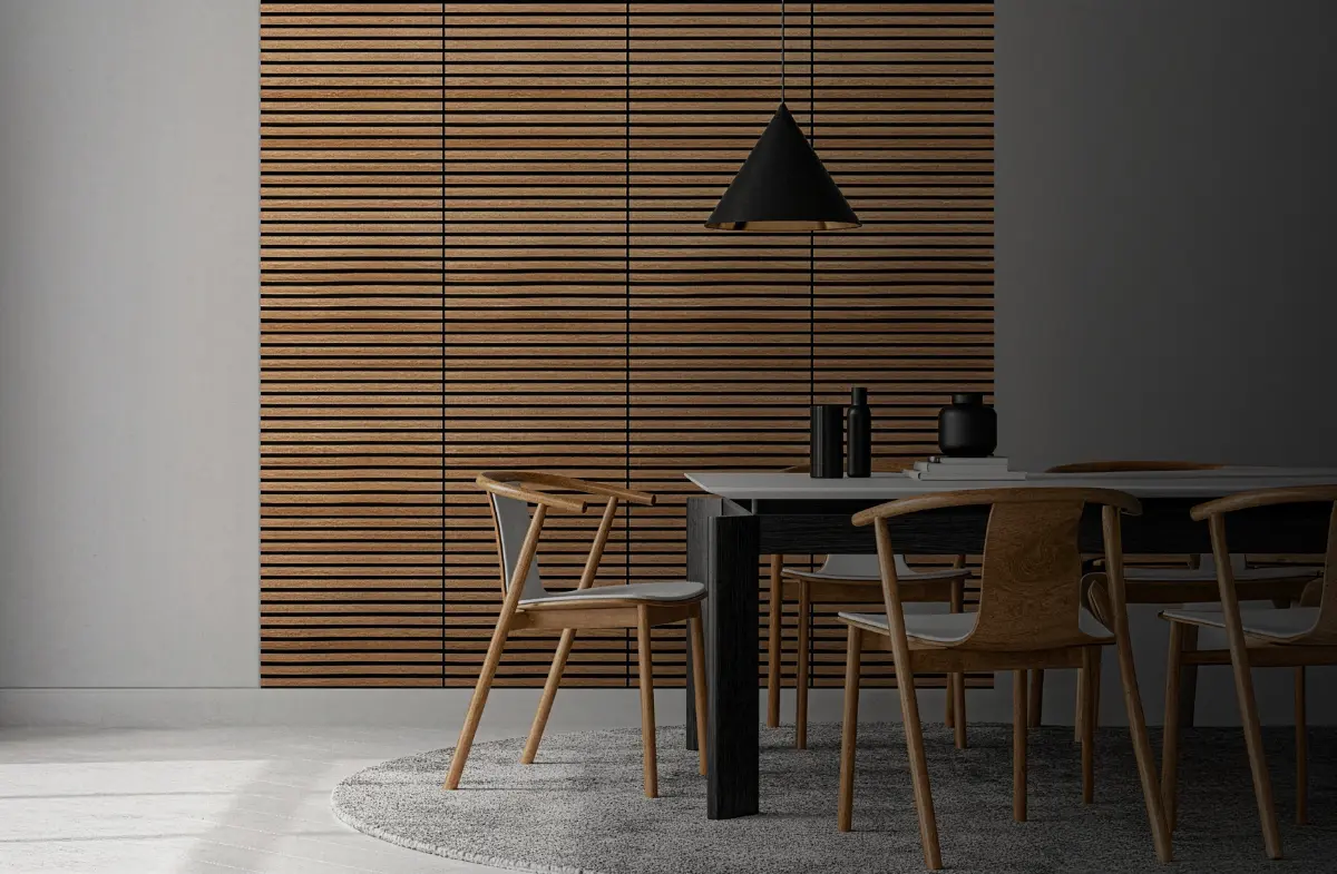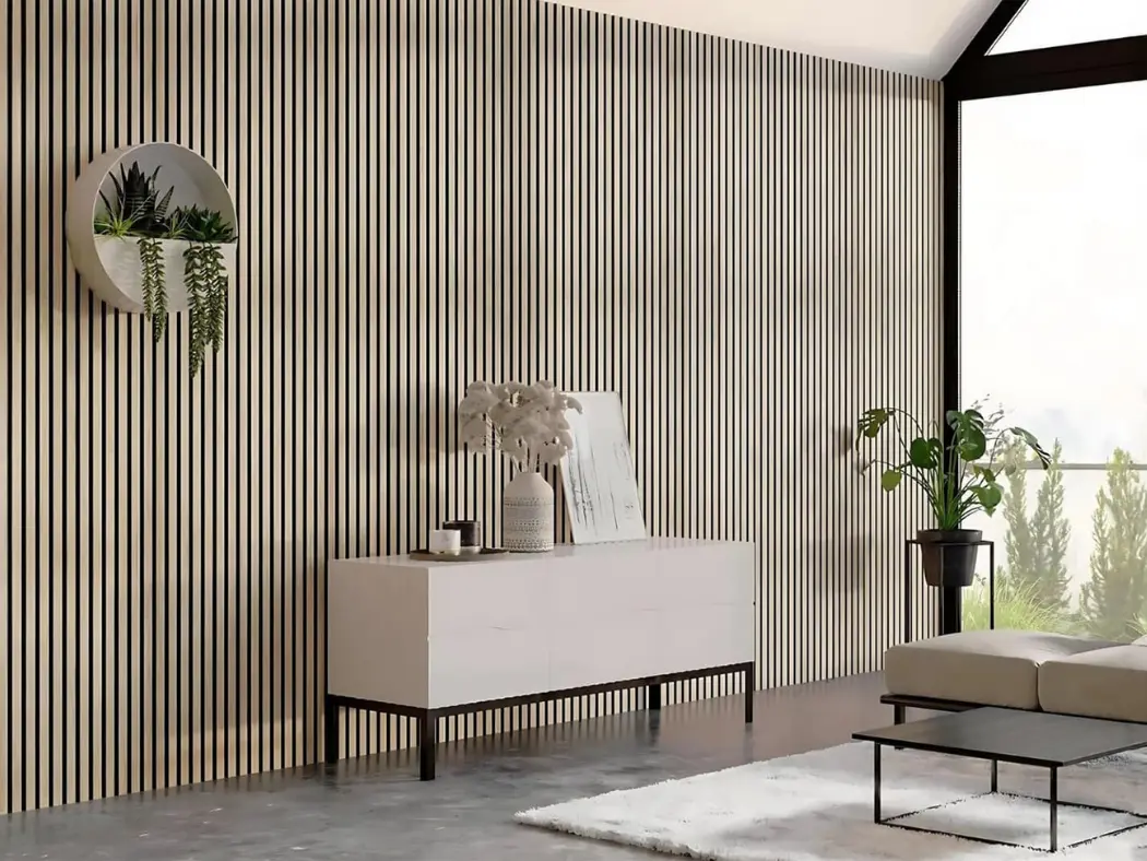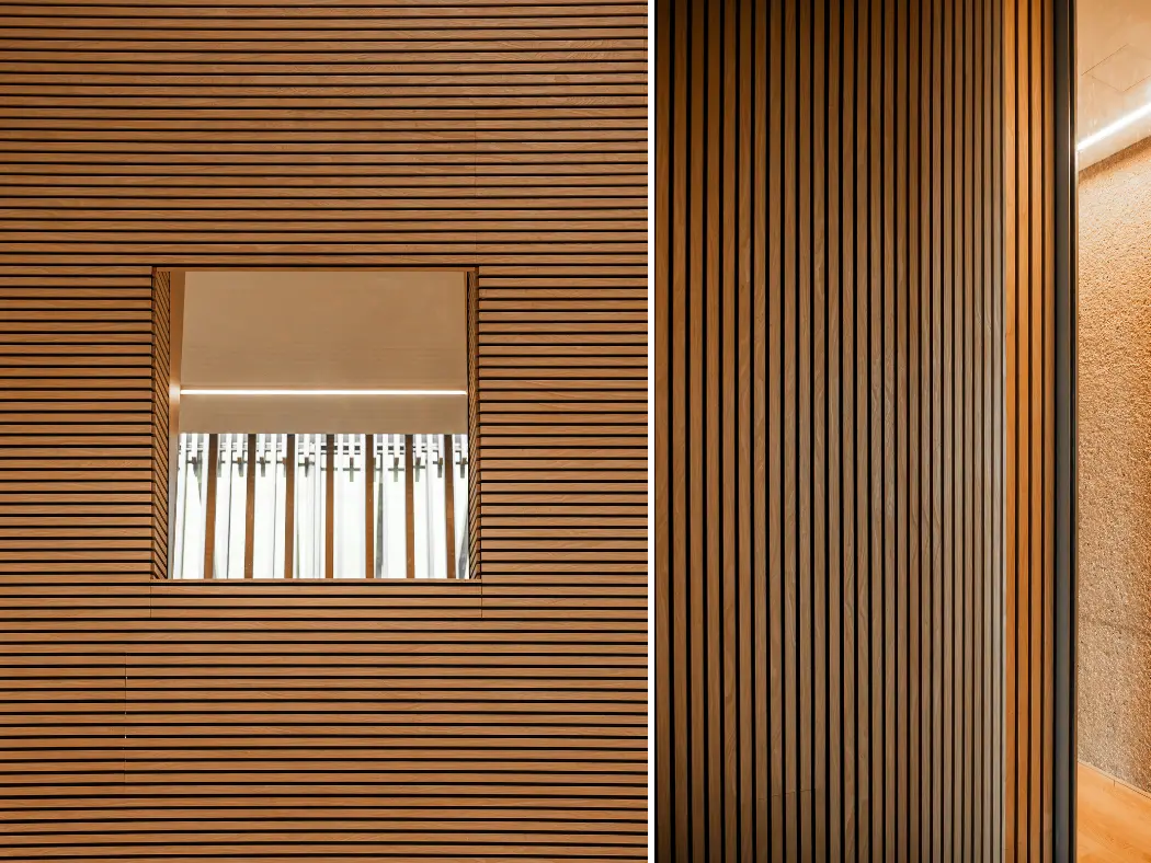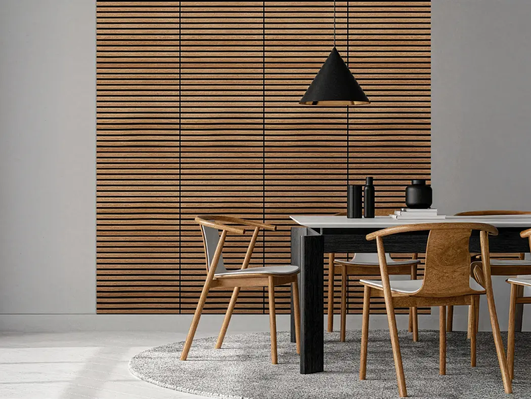 Panel maderable ripiado con apariencia natural, capaz de otorgar no solo un mejor acabado y apariencia a sus proyectos, sino también mejorando y otorgando un aislamiento acústico dentro de sus espacios. Estos paneles están compuestos principalmente de MDF (tablero de fibra de densidad media), que es conocida por su durabilidad, resistencia y facilidad de manipulación. La chapilla de madera natural, aplicada sobre la superficie del MDF, proporciona una apariencia elegante y natural que puede realzar cualquier ambiente interior.